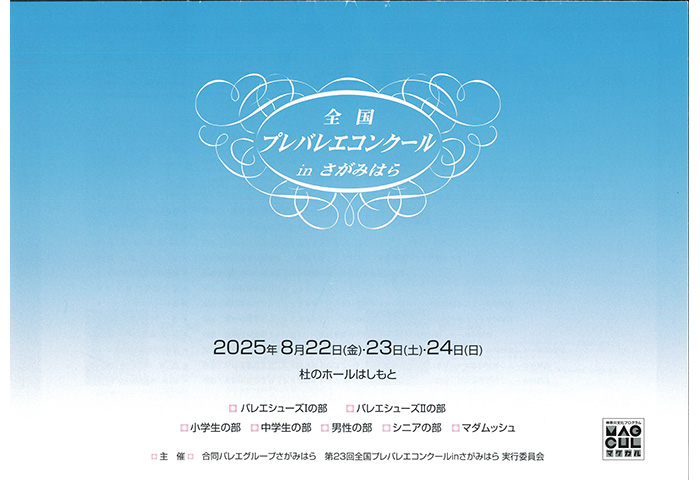 コンクール 全国プレバレエコンクールinさがみはら2025出場 2025.08.22 2025.12.15 コンクール 【バレエシューズⅡの部小学4年生】準奨励賞-櫻井えみり 【バレエシューズⅡの部小学6年生】努力賞-安住藍生 日本国際バレエフェスティバルコンクール出場 前の記事 2025アートダンスカナガワNo.13 次の記事 関連記事 ジャパンバレエコンペティション東京2025出場 2025.04.03 第21回YBC横浜バレエコンクール出場 2025.03.08 第61回FLAP全国バレエコンクール出場 2025.05.06 第11回NBA東京バレエコンクール出場 2025.06.15